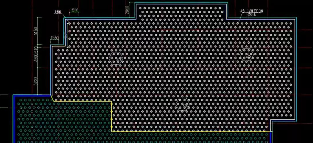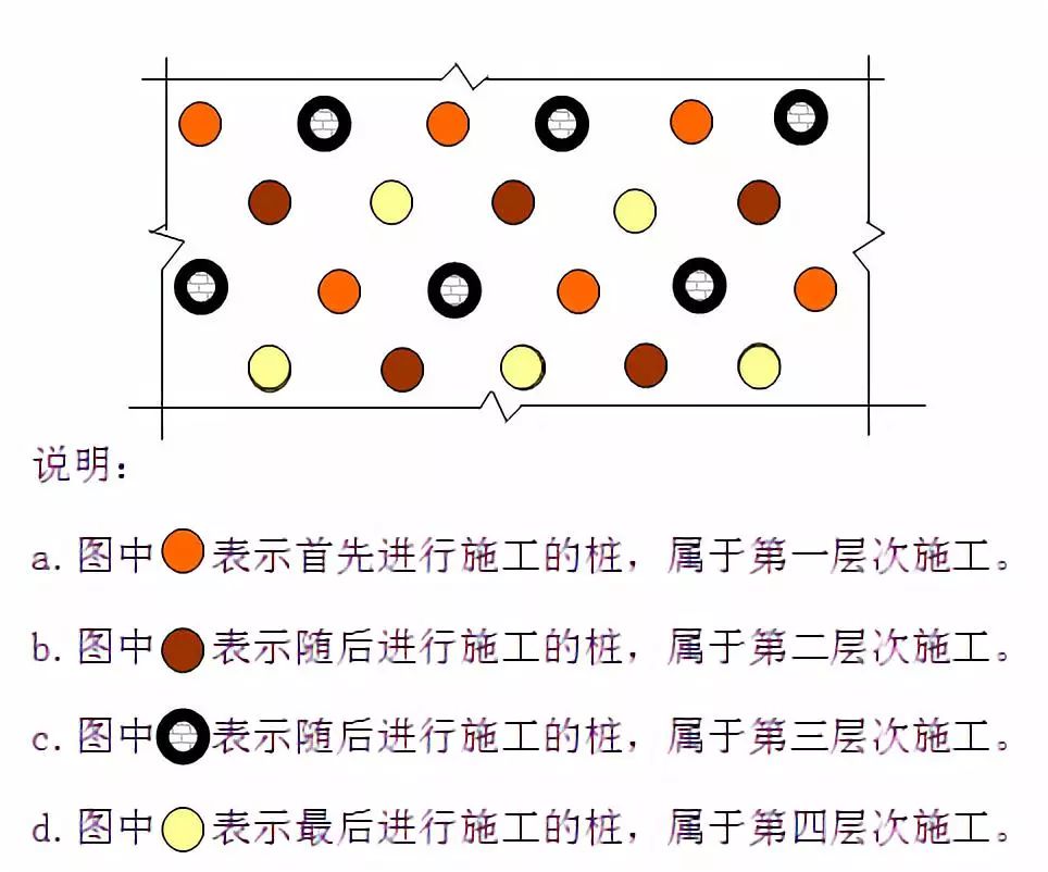 3. 机械成孔:安装钻孔机械,依据设计图纸钻孔到桩底标高,施工顺序控制原则是先外后里,隔行隔桩跳打,分四个层次进行施工。当然可能施工顺序也有其他方式。一般螺旋钻是380mm,成孔后刚好是400mm。