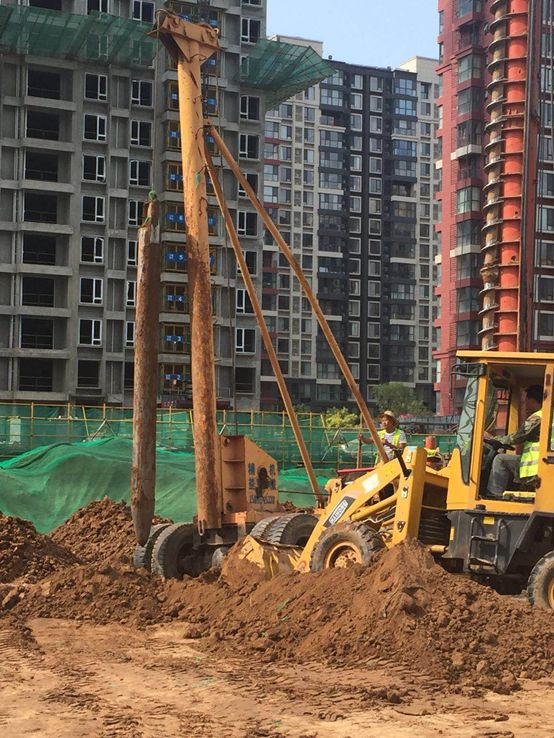 4. 重锤夯扩:用小铲斗车给孔内填水泥土或者2:8灰土或者3:7灰土或其他填充料,每次填0.5m。最后用重锤进行夯扩,一般2吨的重锤夯扩后孔径就是550。注意填充料种类是灰土、素土、碴土、工业无毒废料、砂、毛石、砂卵石、粉煤灰、土夹石、混凝土等材料均可做成各种DDC桩。