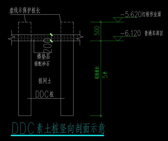 5.车库素土DDC桩:有效桩长5m,虚桩长0.5m。挖虚桩和挖土方深度0.5m。砂石垫层0.2m厚。